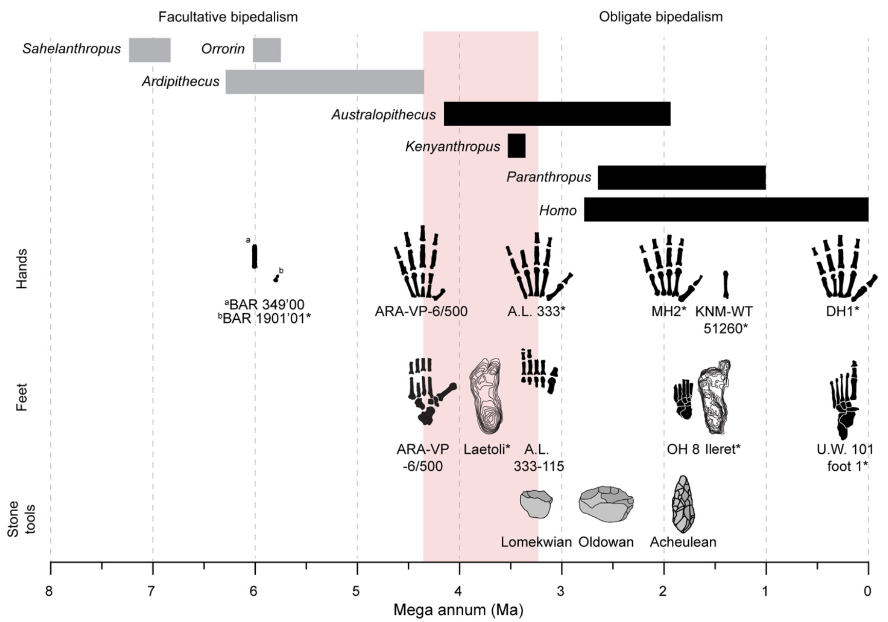 The adaptive transition between Ardipithecus and later hominins, including modern humans, mirrors the evidence for the earliest appearance of stone tools in the archaeological record. This implies that the evolution of human-like manipulative behaviors evolved alongside the evolution of obligate upright walking.