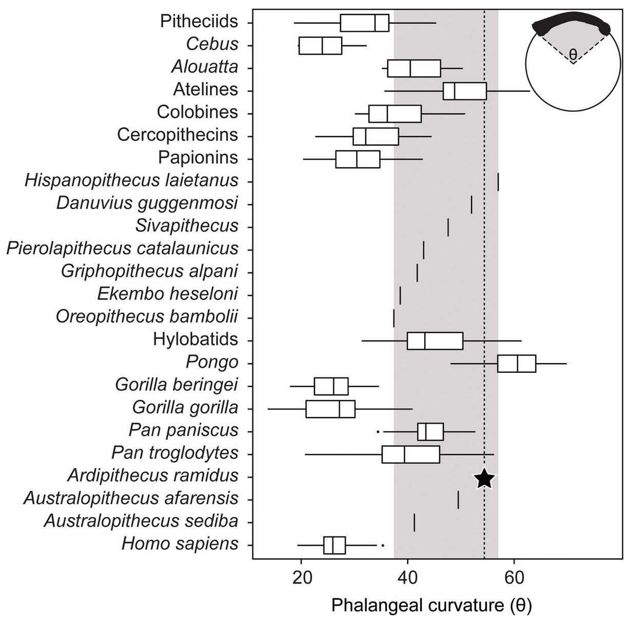 Not only are Ardi’s fingers long, they are also very curved. Curved finger bones are seen in many other suspensory animals and is related to reducing the stresses on the fingers during hanging, and for better grip between the hand and the round tree branch.