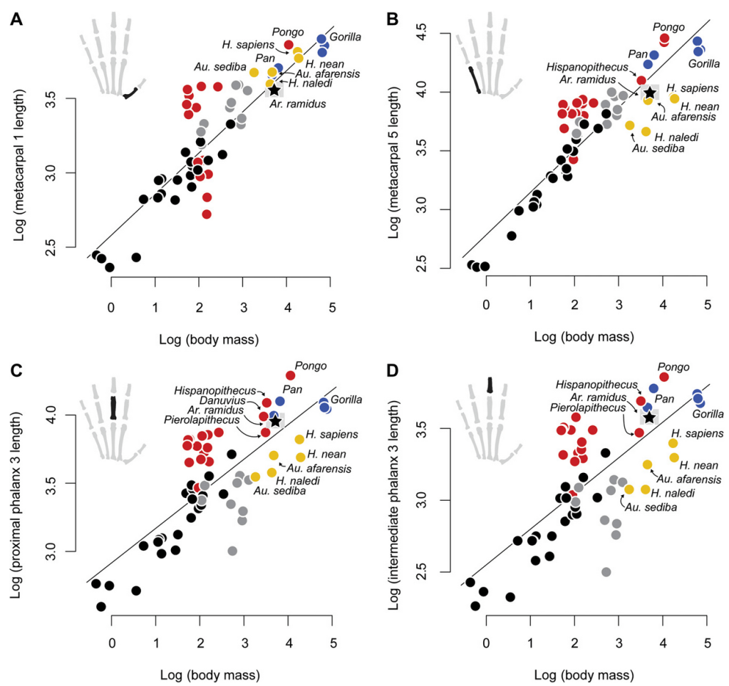 Ardipithecus had relatively long fingers, more similar to other primates that engage in suspensory behaviors (red dots), and like chimpanzees and gorillas that knuckle-walk when on the ground to compensate for their longer hands useful for suspension and vertical climbing when in the trees (blue dots). However, the relative size of the bones of the palm are more similar to later hominins.