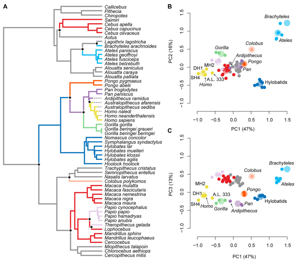 After showing how the size and shape of the Ardipithecus hand fossils are more similar to apes than modern humans or monkeys (as Ardi has been suggested to more resemble), we used the measurements from 53 species of primates to reconstruct the evolution of the primate hand, specifically how it has been used to move around. This evolutionary modeling suggested that Ardi and chimpanzees share adaptations to vertical climbing and suspensory behaviors. It also shows a marked transition towards more human-like hand shape in later homins.